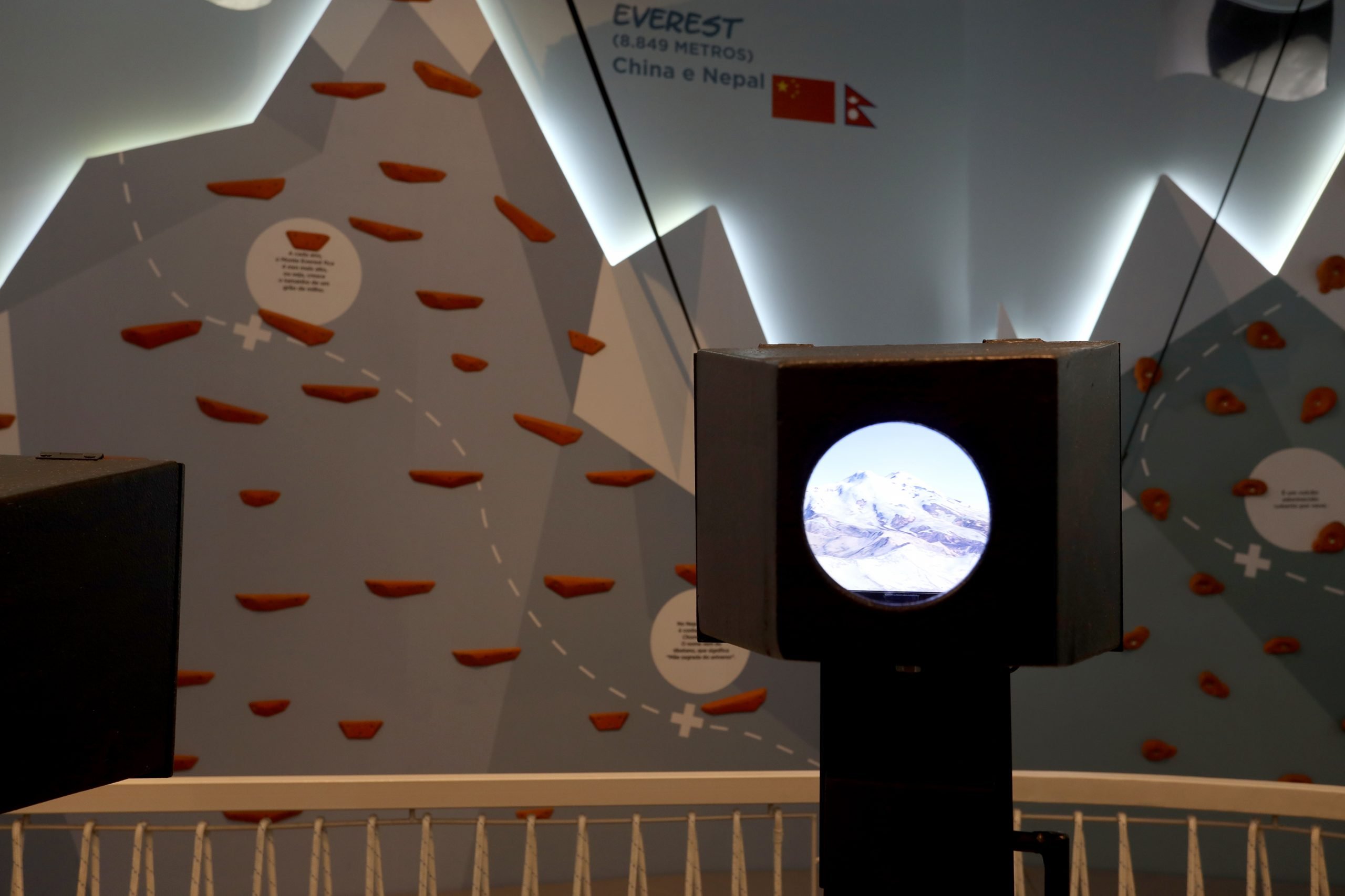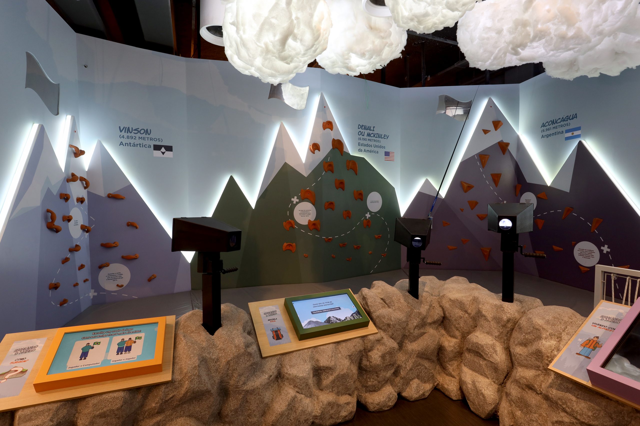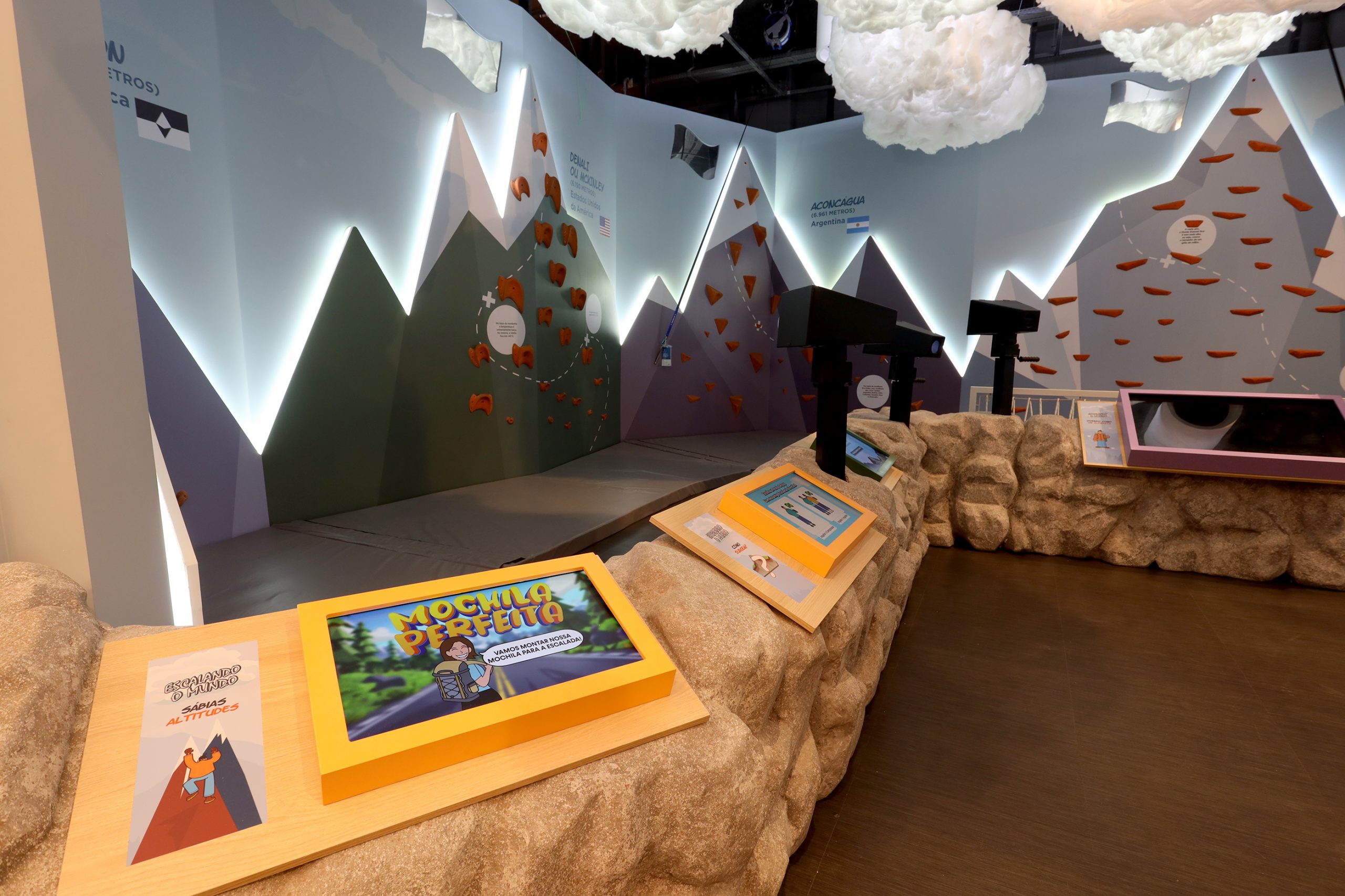 A exposição apresenta o maior cume de cada continente, e as crianças podem escalar cada um deles e praticar seu conhecimento através de jogos que abordam desde como se forma uma montanha até o que o alpinista leva em sua bagagem.